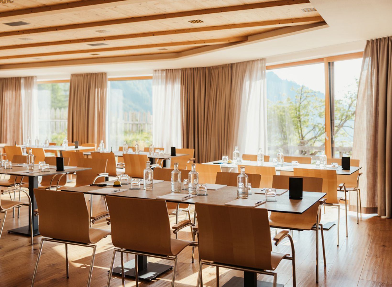 Unser 100 m² großer Tagungsraum ist dank bodentiefer Fenster mit natürlichem Licht durchflutet und bietet einen atemberaubenden Blick auf das darunter liegende Tal. Mit einer Kapazität von bis zu 50 Personen kann der Raum nach Bedarf als Theater, Hufeisen, Klassenzimmer oder in anderer gewünschter Bestuhlung eingerichtet werden. Seine großzügige Fläche ermöglicht die Einrichtung von Kaffeestationen im Raum oder alternativ Kaffeepausen im Bereich vor dem Raum. Neben dem Hauptsaal steht ein zweiter kleinerer Raum zur Verfügung, was eine Gesamtkapazität von 80 Personen ermöglicht.